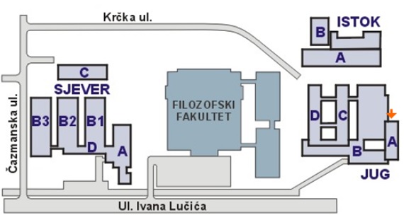 Pozicija predavaonica označena je narančastom strelicom.